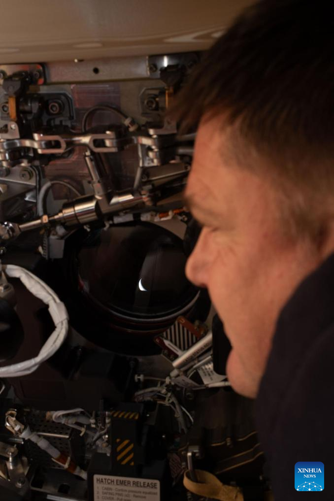 O astronauta da Agência Espacial Canadense, Jeremy Hansen, observa a Terra através de uma das janelas da espaçonave Orion, em 6 de abril de 2026. A tripulação da missão Artemis II quebrou, na segunda-feira, o recorde de maior distância já percorrida por humanos a partir da Terra, superando a marca alcançada pela Apollo 13 em abril de 1970, segundo a NASA. (NASA/Divulgação via Xinhua)
