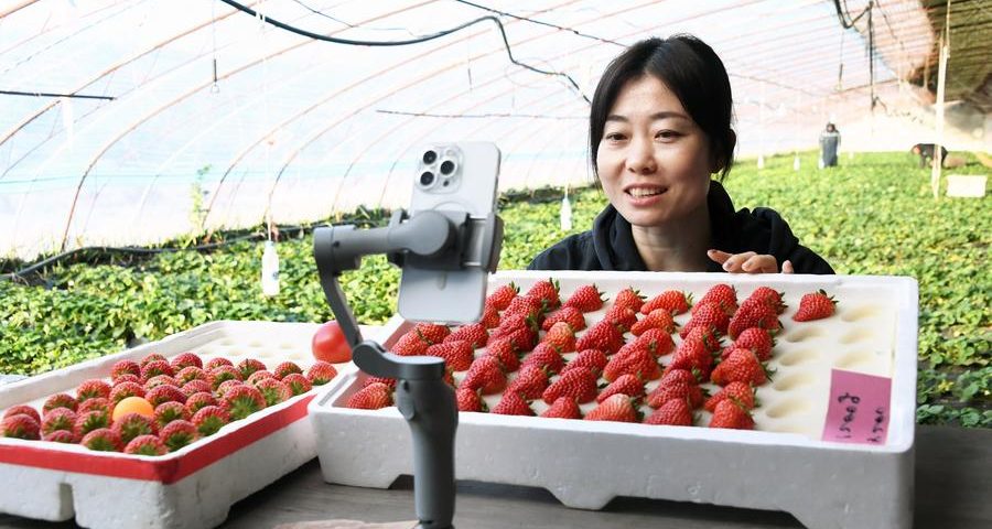 (240125) -- BEIJING, Jan. 25, 2024 (Xinhua) -- A staff member promotes strawberries via livestreaming at a greenhouse in Pinggu District of Beijing, capital of China, on Jan. 25, 2024. Farmers here are busy harvesting greenhouse-cultivated strawberries to meet the customers' needs for the upcoming Spring Festival holiday. (Xinhua/Ren Chao)