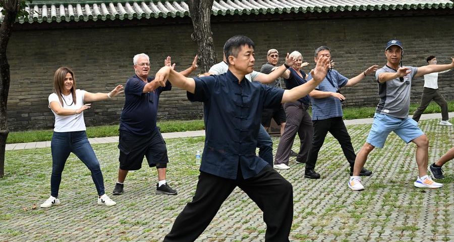 (240913) -- BEIJING, Sept. 13, 2024 (Xinhua) -- Members of a delegation of over 10 Los Angeles-based travel agents learn Tai Chi in Beijing, capital of China, Sept. 10, 2024. TO GO WITH "Across China: U.S. travel agent delegation savors China's rich culture, modern convenience" (Xinhua/Zhao Chenjie)