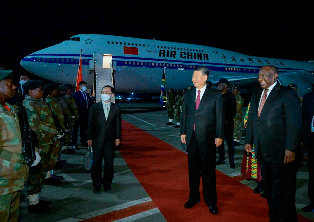 O presidente sul-africano, Cyril Ramaphosa, juntamente com a ministra de Relações e Cooperação Internacionais da África do Sul, Naledi Pandor, e Nkosazana Clarice Dlamini-Zuma, ministra da Presidência responsável por Mulheres, Jovens e Pessoas com Deficiência, saudaram calorosamente Xi no Aeroporto Internacional OR Tambo, de Joanesburgo.