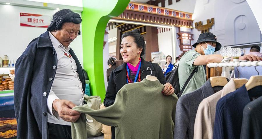 (230617) -- LHASA, June 17, 2023 (Xinhua) -- A staff member presents cashmere clothing during the 5th China Xizang Tourism and Culture Expo in Lhasa, southwest China's Tibet Autonomous Region, June 17, 2023. The 5th China Xizang Tourism and Culture Expo opened here on Friday. The three-day expo is one of the most important events on Tibet's cultural calendar. Nearly 1,000 businesses from home and abroad have attended the event, bringing about 10,000 different products. (Xinhua/Sun Fei)